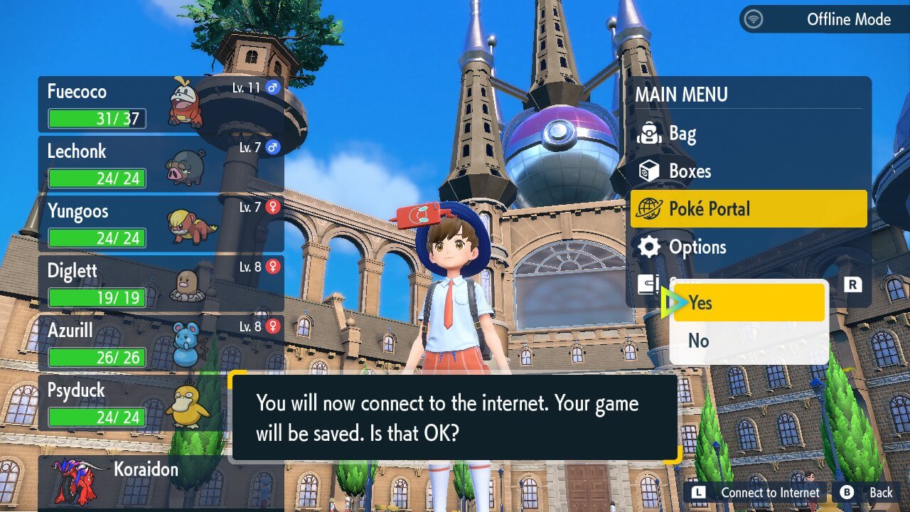 Step 1: Press “” to access MAIN MENU, Press “” to connect to the Internet and select “Yes” to connect and save the game, then choose “Poké Portal”.