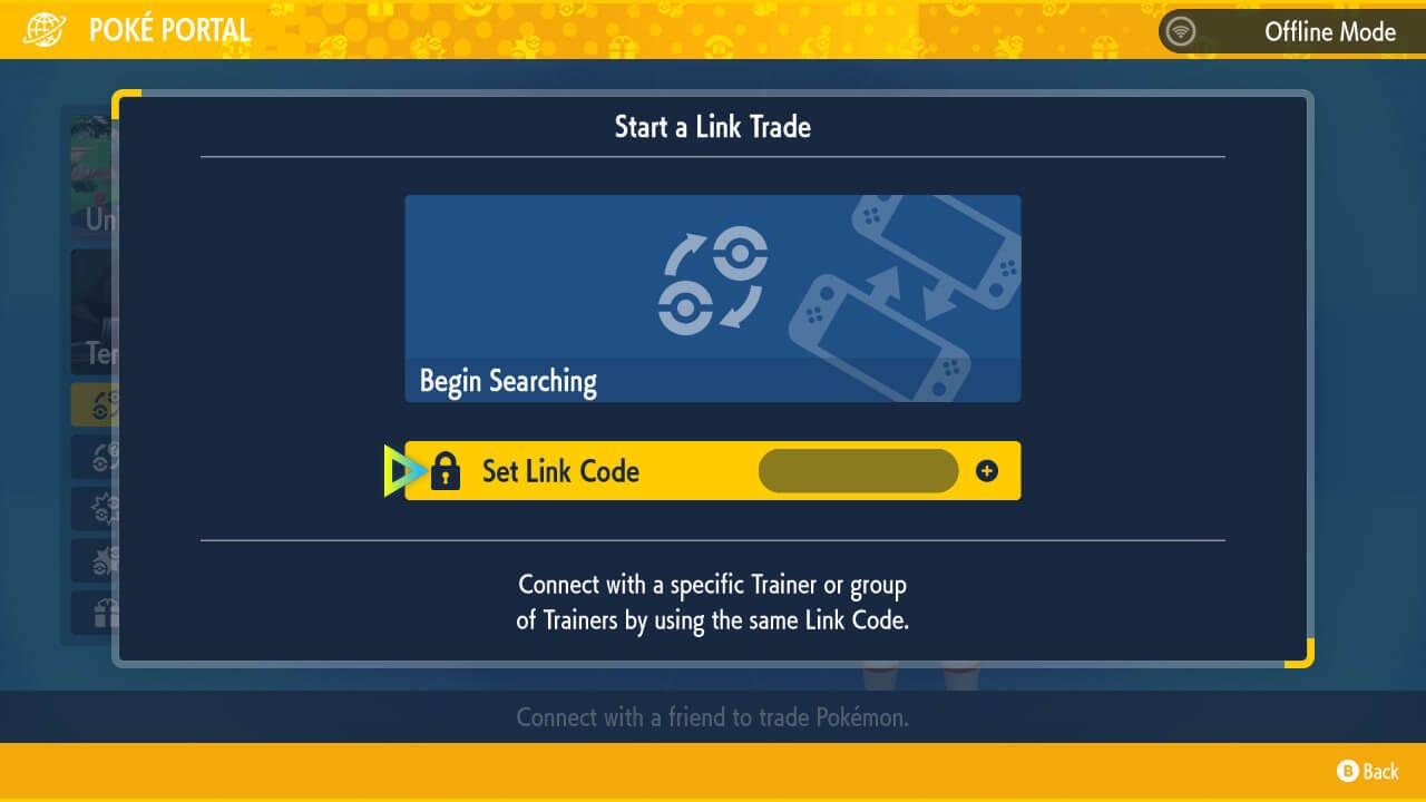 Step 2: Choose “Link Trade” then “Set Link Code”, now set an eight-digit Link Code (try not to use the same digits), now select “Begin Searching” and select “Yes” to begin searching.