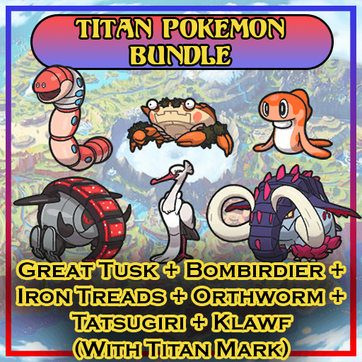 The Titan Pokemon Bundle include the 6 Titan Pokemon obtainable in Pokemon Scarlet and Violet. They Pokemon are larger then other and the have a Titan Mark.